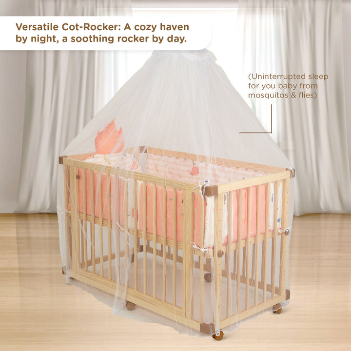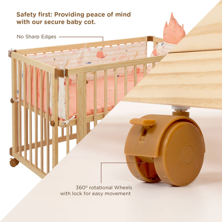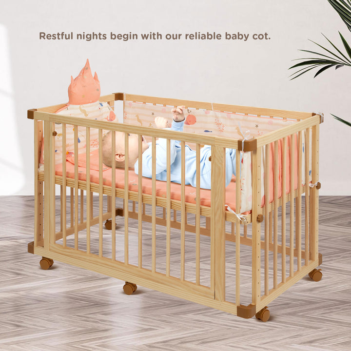 Dreamy Love Spacious Wooden Baby Cot/Baby Crib with soft mattress, Safety Locking Wheels, Height adjustment, Easy Assembly, Attachable to parent's Bed, Suitable for 0 to 3 years (Pine Wood)