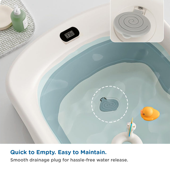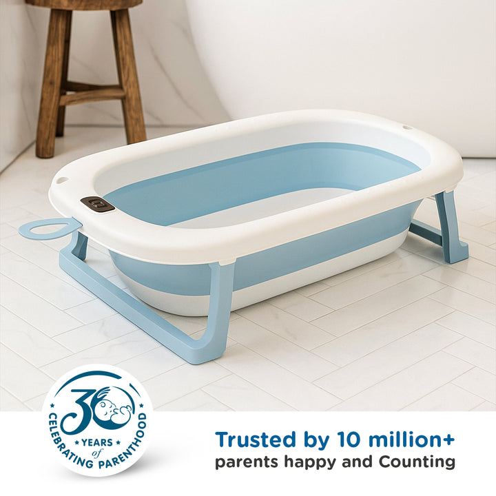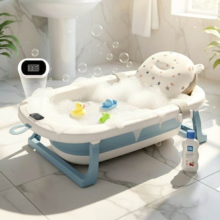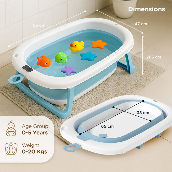 Foldable Baby Bath Tub with Digital Temperature Display and Soft Newborn Support Pad Blue