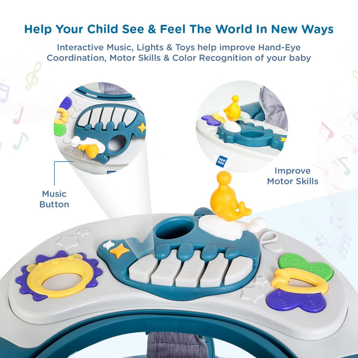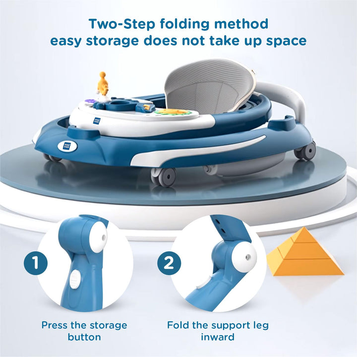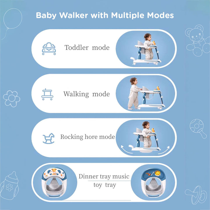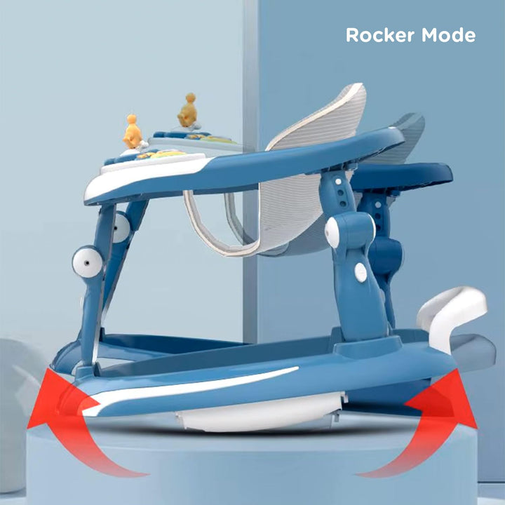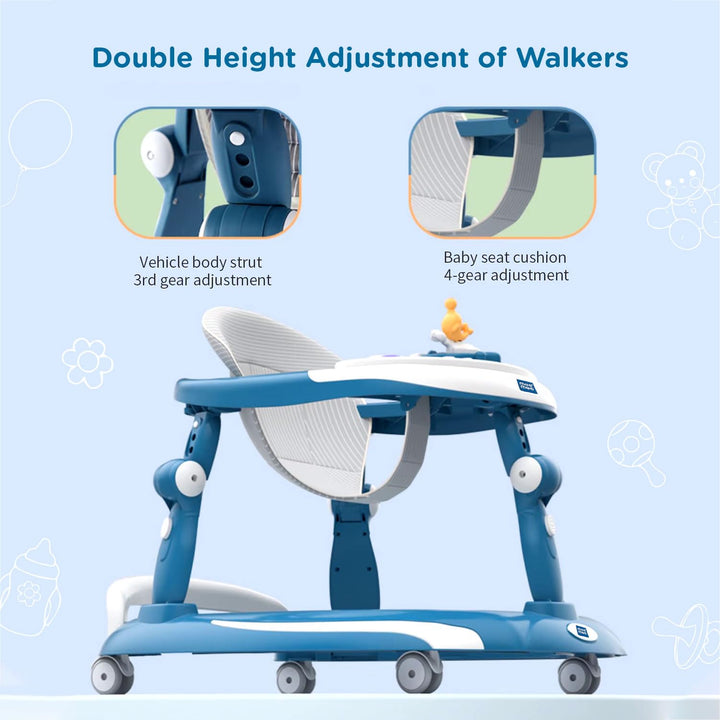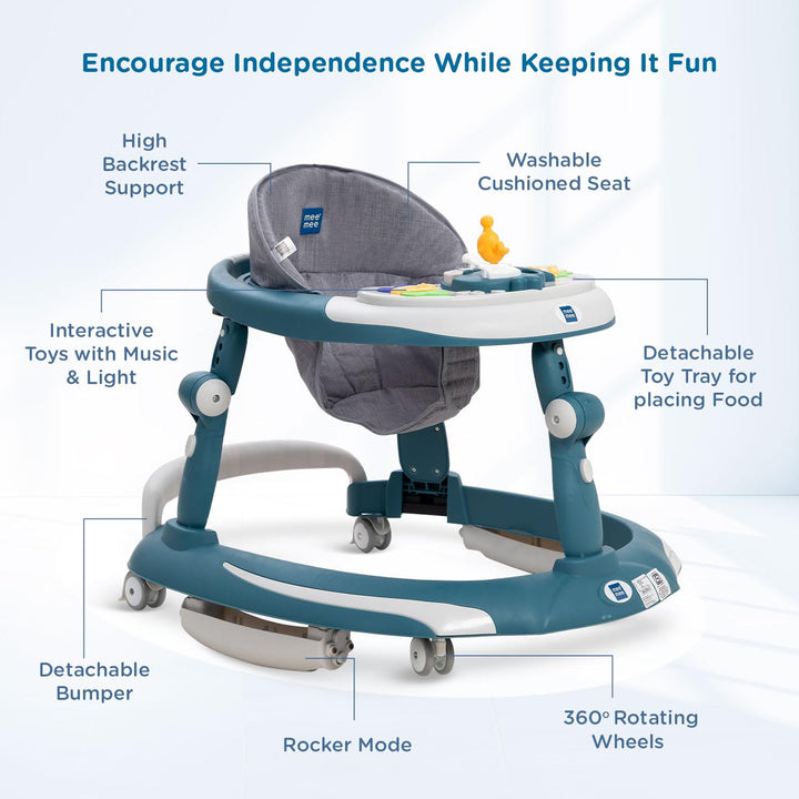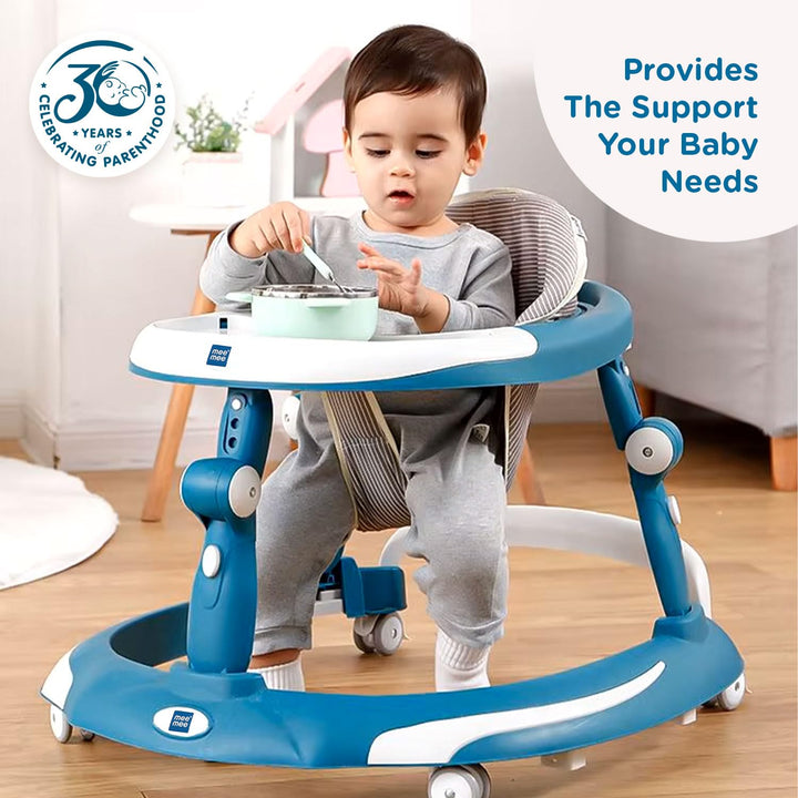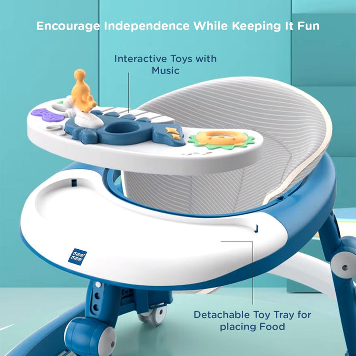 Mee Mee 3 in 1 Baby Walker Rocker and Push Walker For 6-18 Months Baby | 3 Level Adjustable Height, With Detachable Musical Toy Bar & Light | Parental Push Handle, Anti-Rollover Folding Walker For Upto 15kg Baby (Blue)