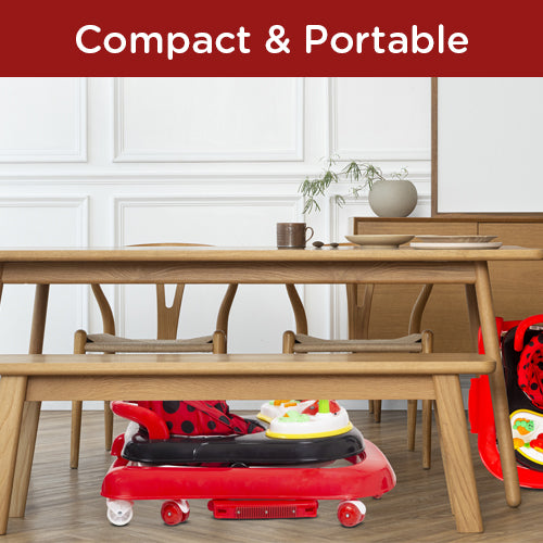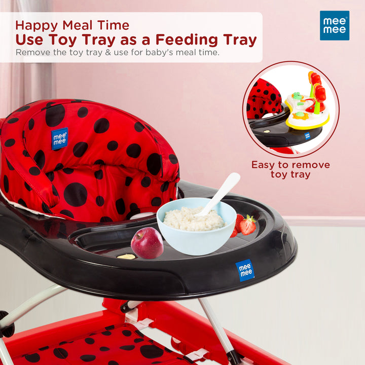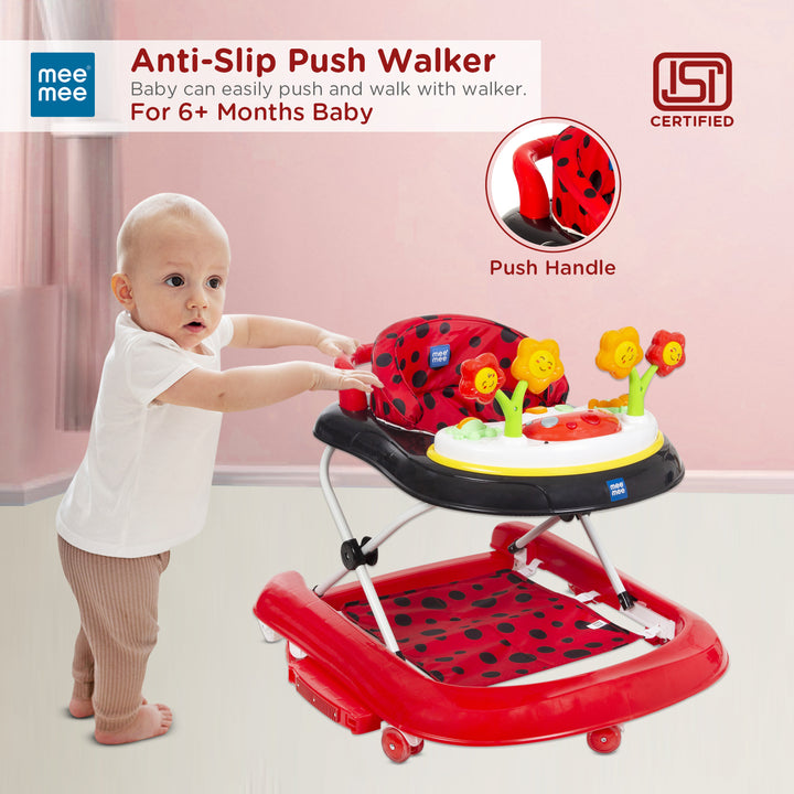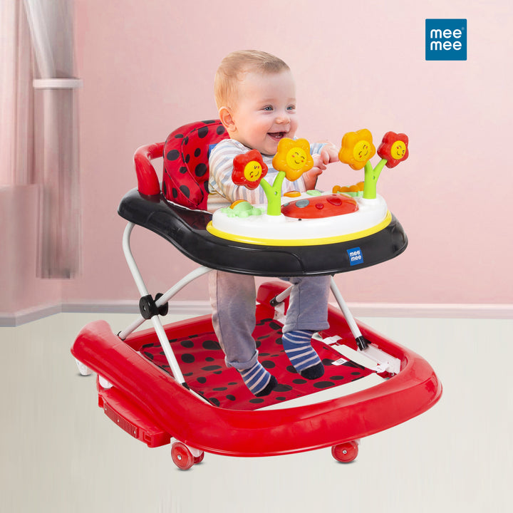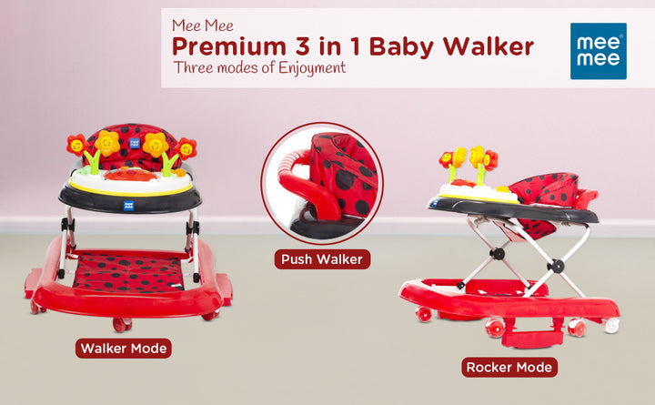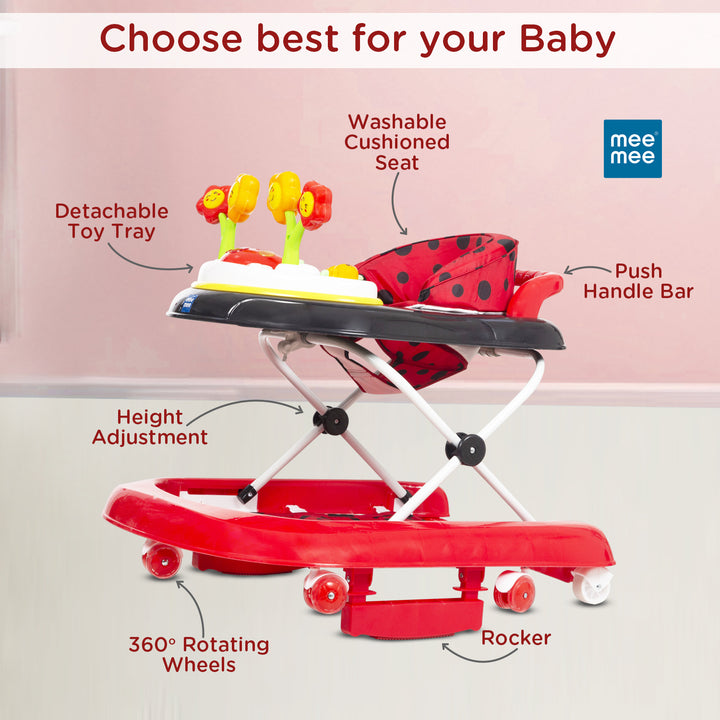 The Mee Mee Baby Walker is designed to help your baby take their first steps with confidence. It features an adjustable cushioned seat, high backrest, and 360° rotating wheels for smooth movement. The sturdy frame ensures stability, while the detachable toy tray keeps your little one engaged. A perfect combination of safety and comfort for growing babies!