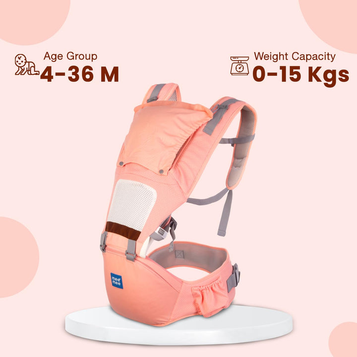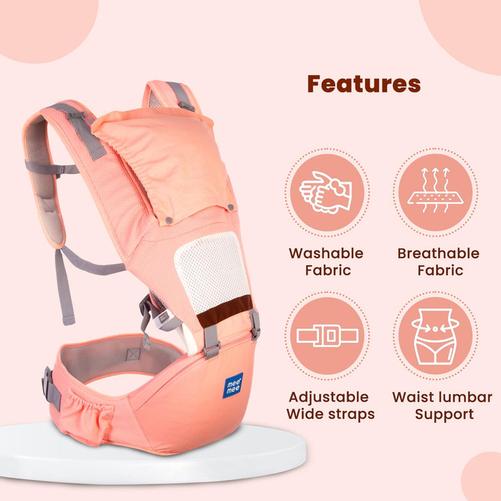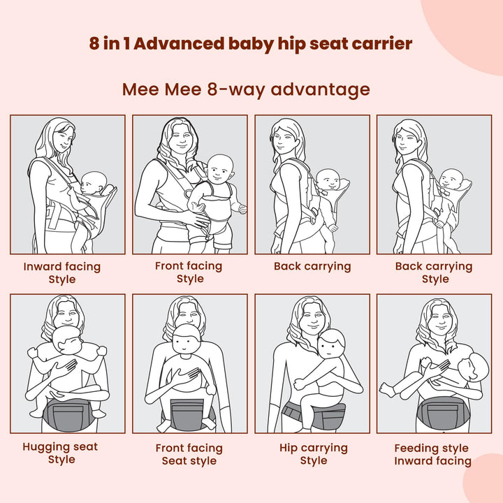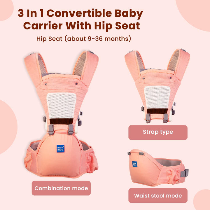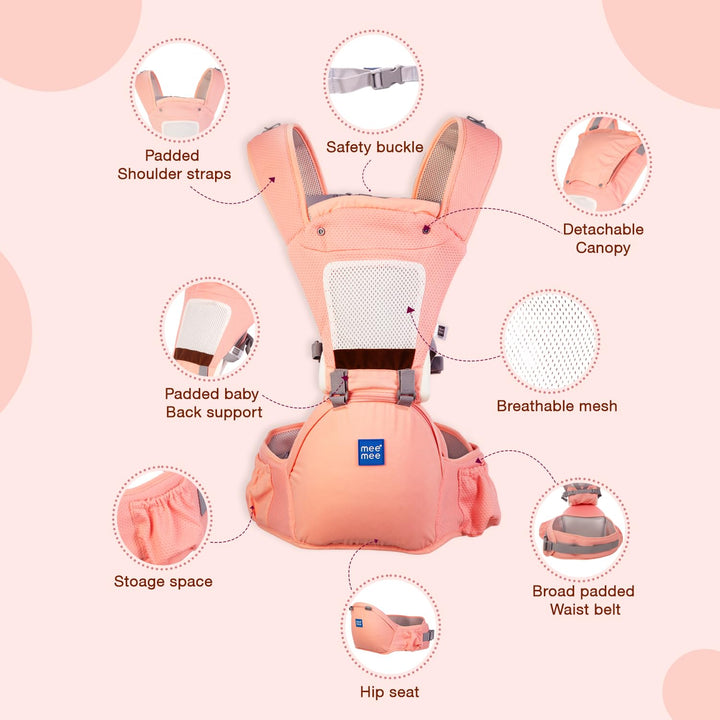 Mee Mee 8-in-1 Baby Carrier with Detachable Hip Seat Sling Carrier | Ergonomic Design | Convertible | Cushioned | Toddlers Carry Bag with Strong Back & Lumbar Support | Adjustable Soft Kangaroo Waistbelt | 9 to 48 Months Infants | Up To 16 kgs | Pink |