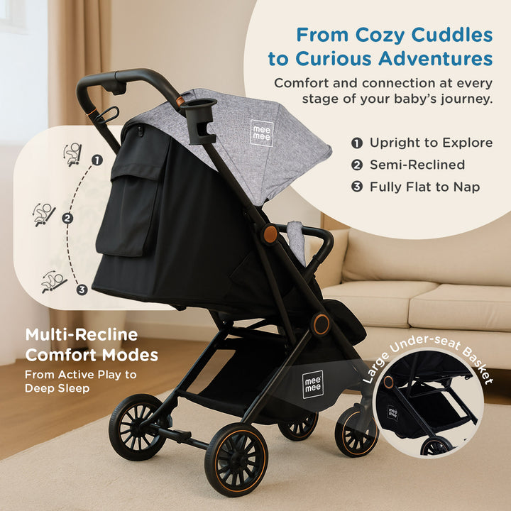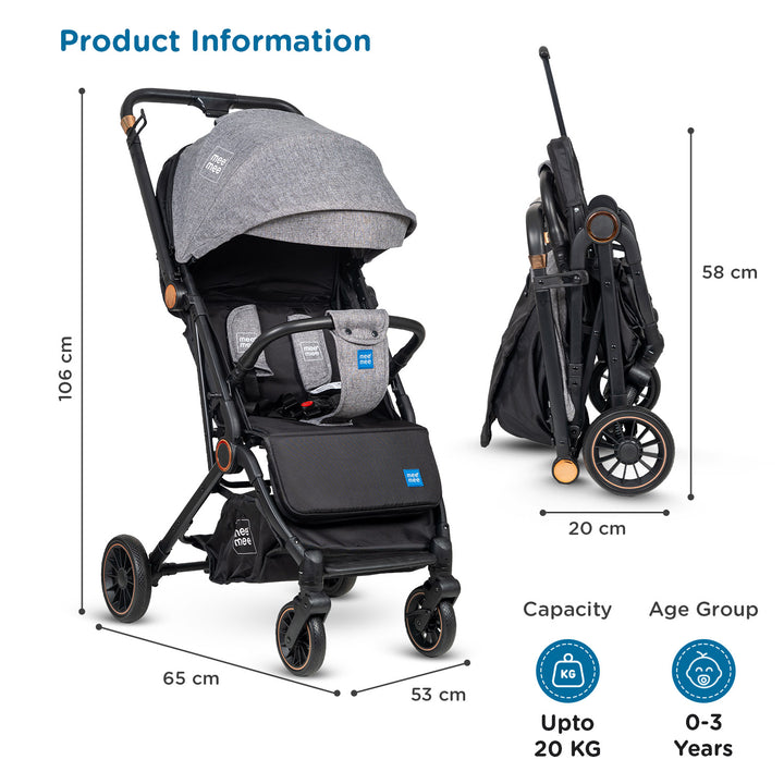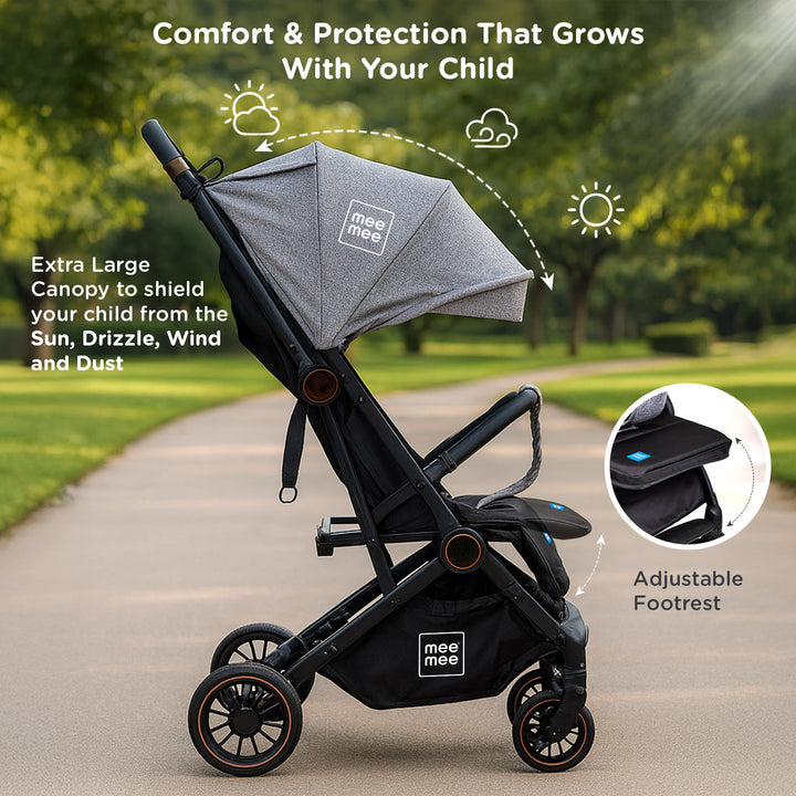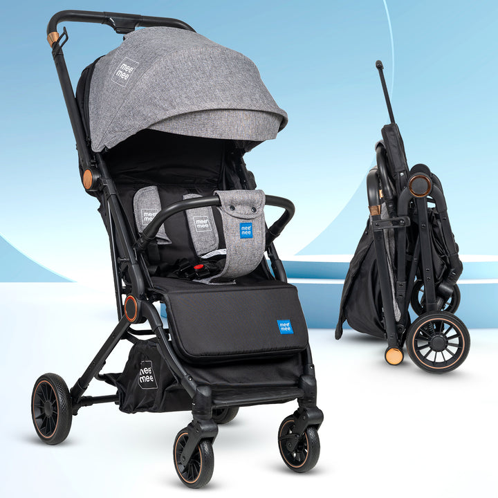 The Mee Mee Air Luxe Ultra-Compact Pram is designed for modern parents seeking comfort, safety, and ultimate portability. Featuring a lightweight yet durable aluminum frame, this stroller is perfect for travel and daily use. It boasts a one-hand quick-fold mechanism that collapses the stroller into a compact, self-standing unit, making storage and transport effortless. The multi-position reclining seat, adjustable canopy, and advanced suspension system ensure a smooth and comfortable ride for your baby from newborn to toddler.