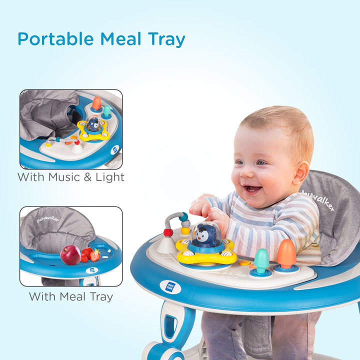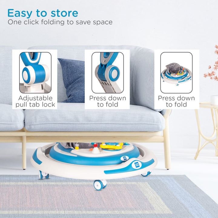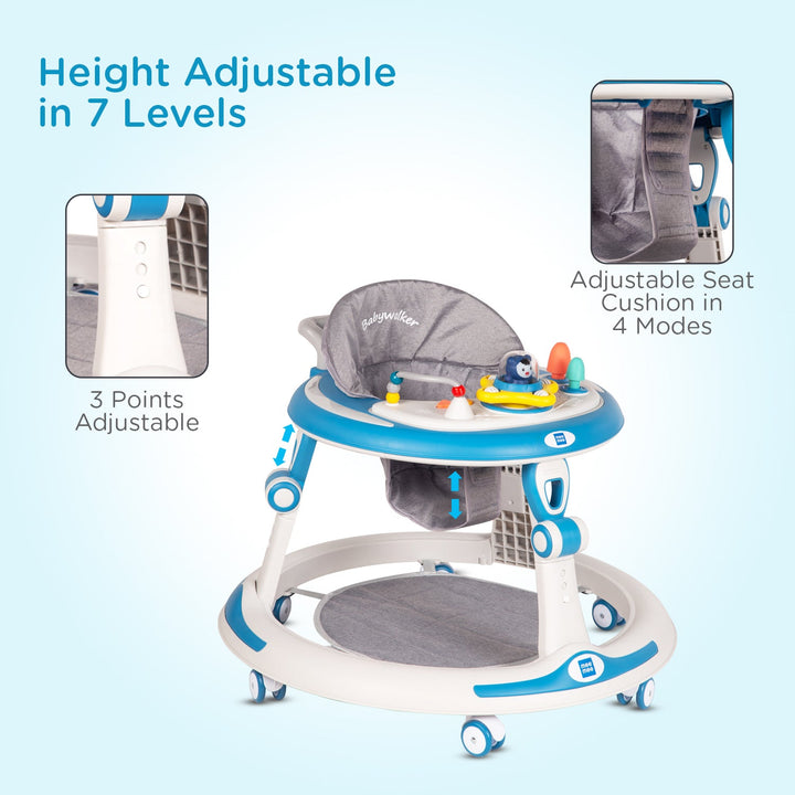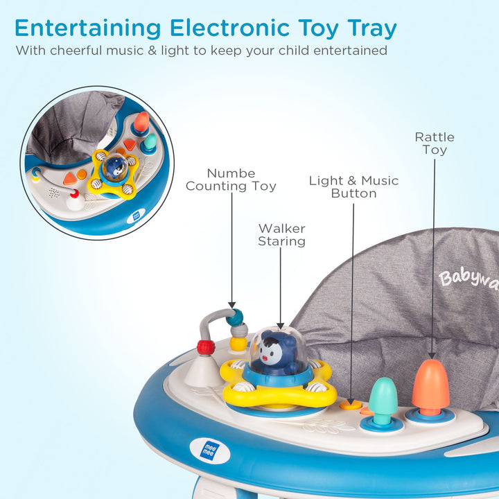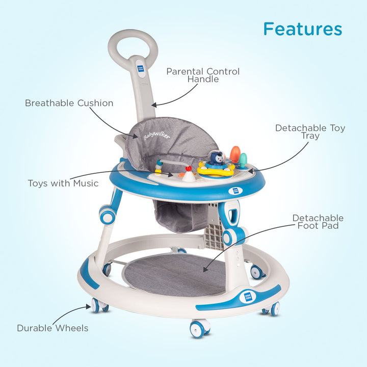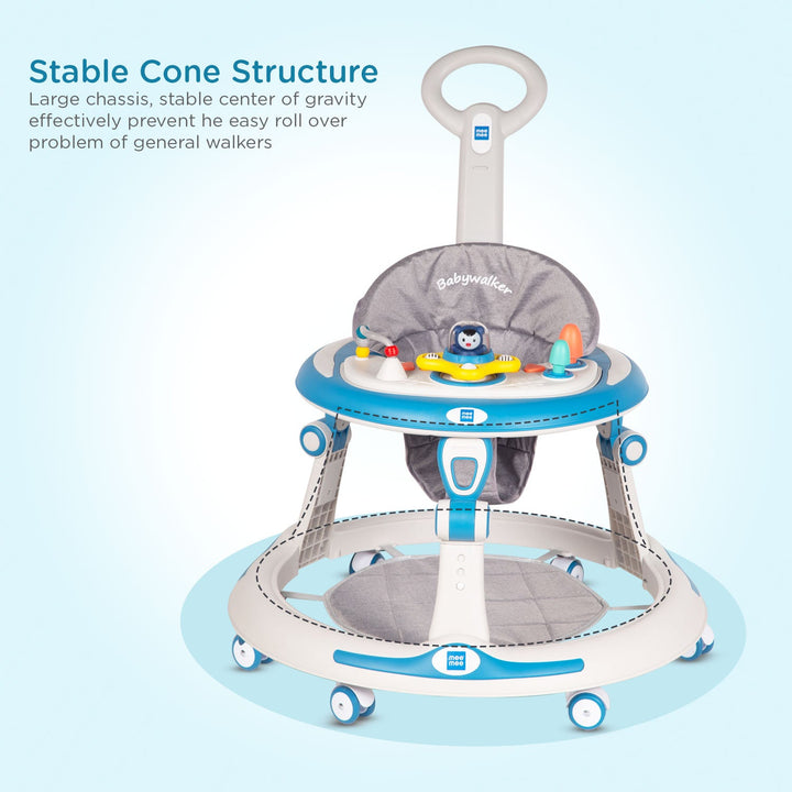 Mee Mee Baby Activity Walker for 6-18 Months Baby | 7 Level Adjustable Height, 360° Wheels with Detachable Musical Toy Bar | Parental Push Handle, Anti-Rollover Folding Walker Upto 15kg (Blue)