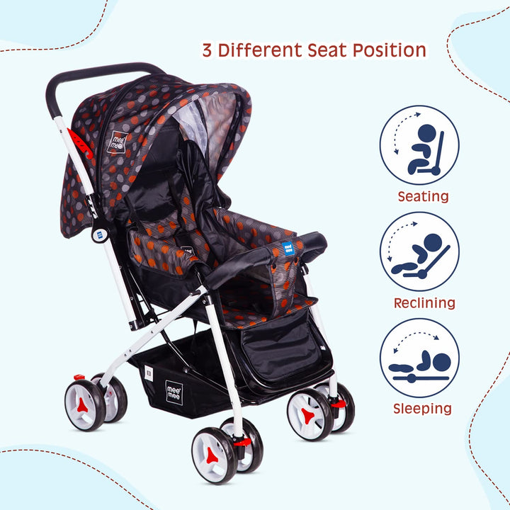 Mee Mee Baby Pram with 3 Seating Positions, Reversible Handle, Safety Harness, Rear wheel breaks, Mosquito net, and Spacious Storage_Black