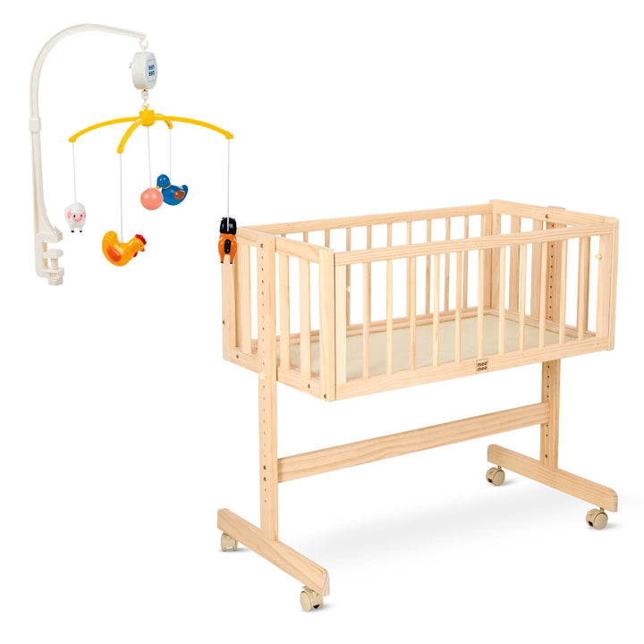Mee Mee Baby Premium Wooden Cot, Baby Cradle, Baby Crib with Lockable Wheels Suitable for New Born to 1.5 Years Baby Boys and Girls + Mee Mee Musical Animal Cot Mobile (5-Toy Safari Theme)
