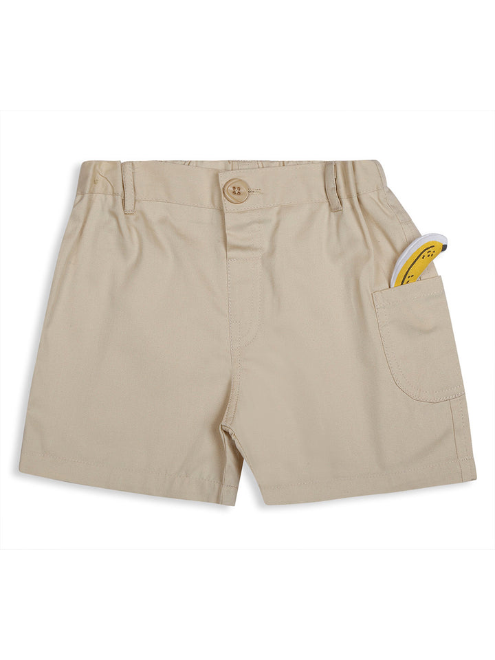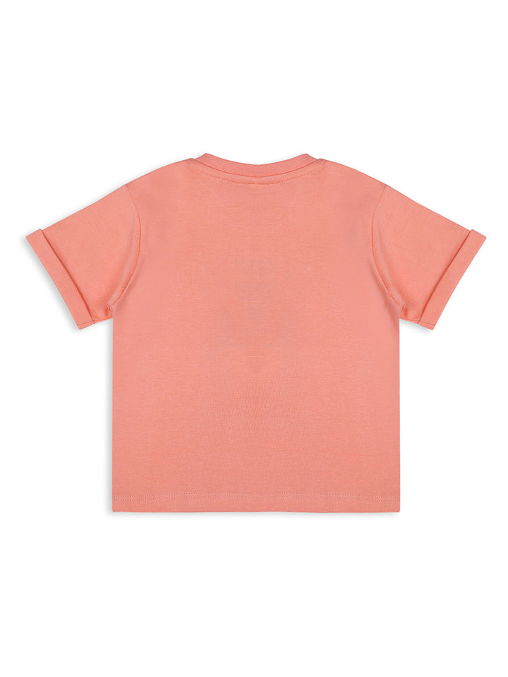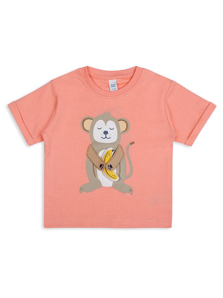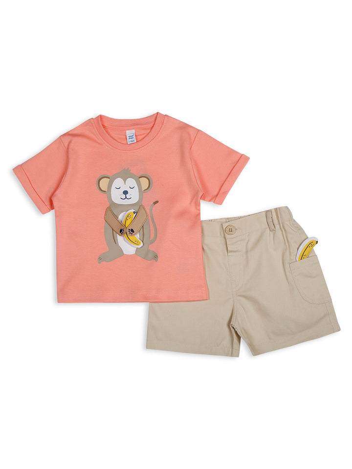 Add a touch of fun to your little one's wardrobe with this adorable Mee Mee short set. The coral t-shirt features a cute monkey print with a playful banana detail, paired with beige shorts that have a matching banana peeking out of the pocket. Made from soft and breathable cotton, this set ensures all-day comfort, making it perfect for casual outings or playtime.