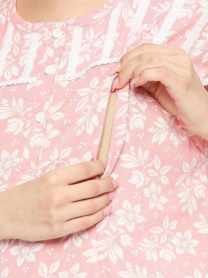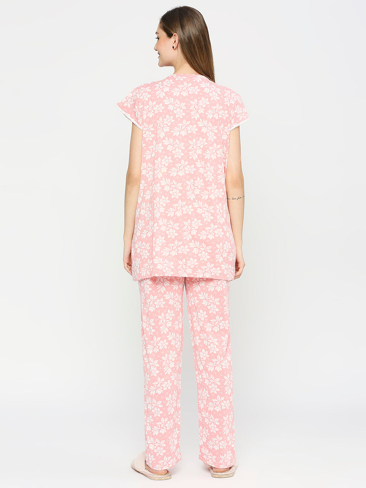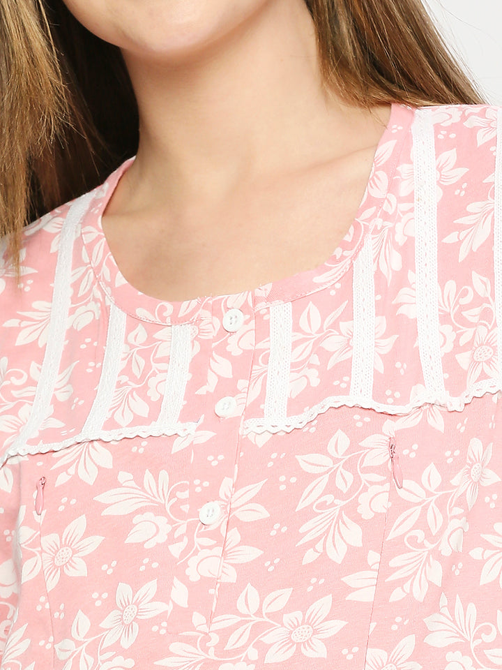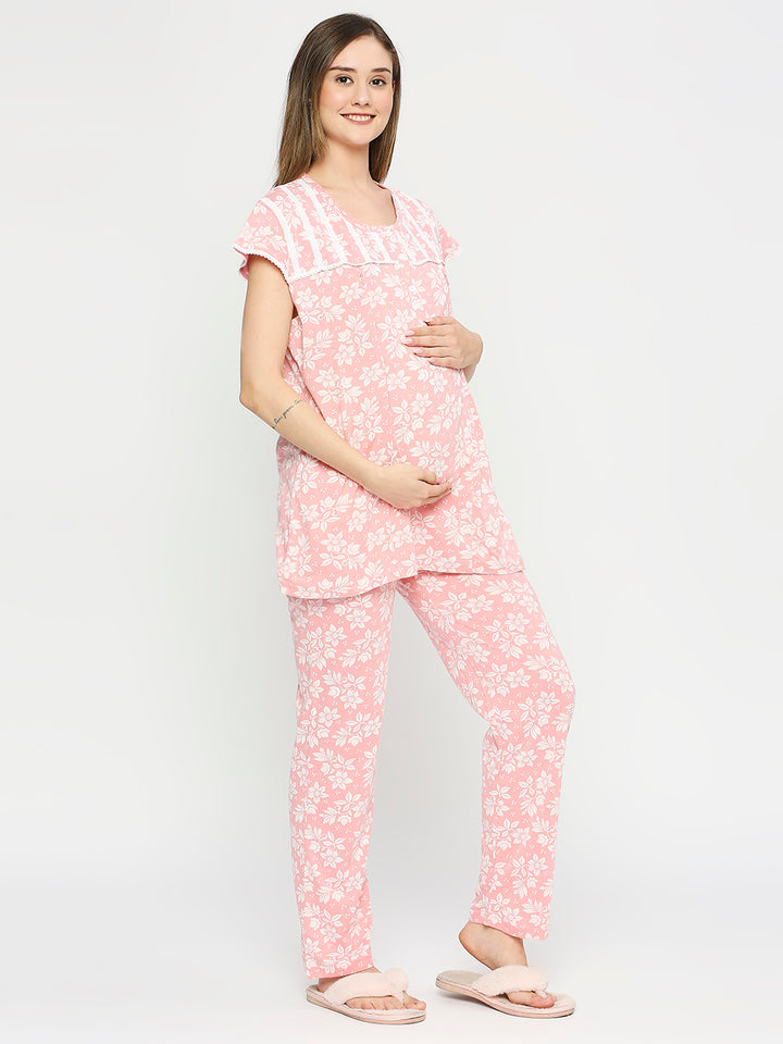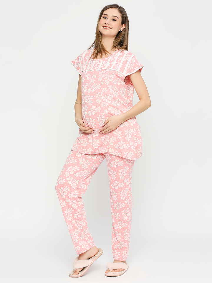 Mee Mee Coral Pink Maternity Nightsuit | Soft Knit Fabric with Floral Print