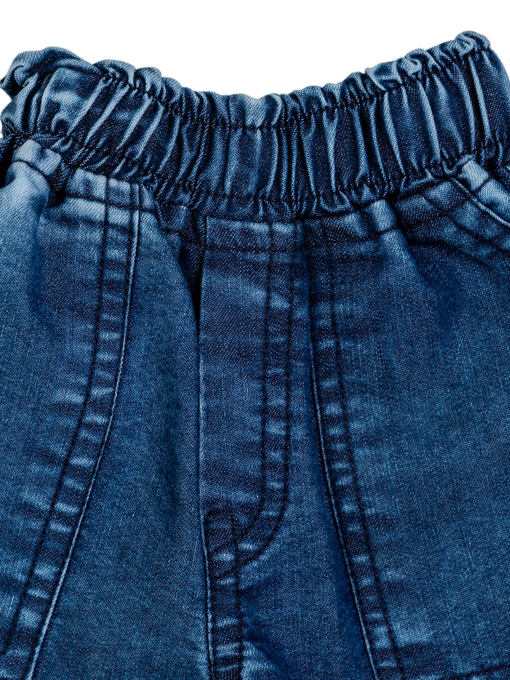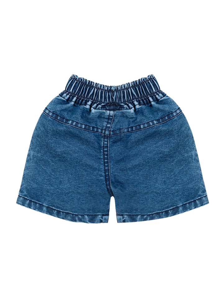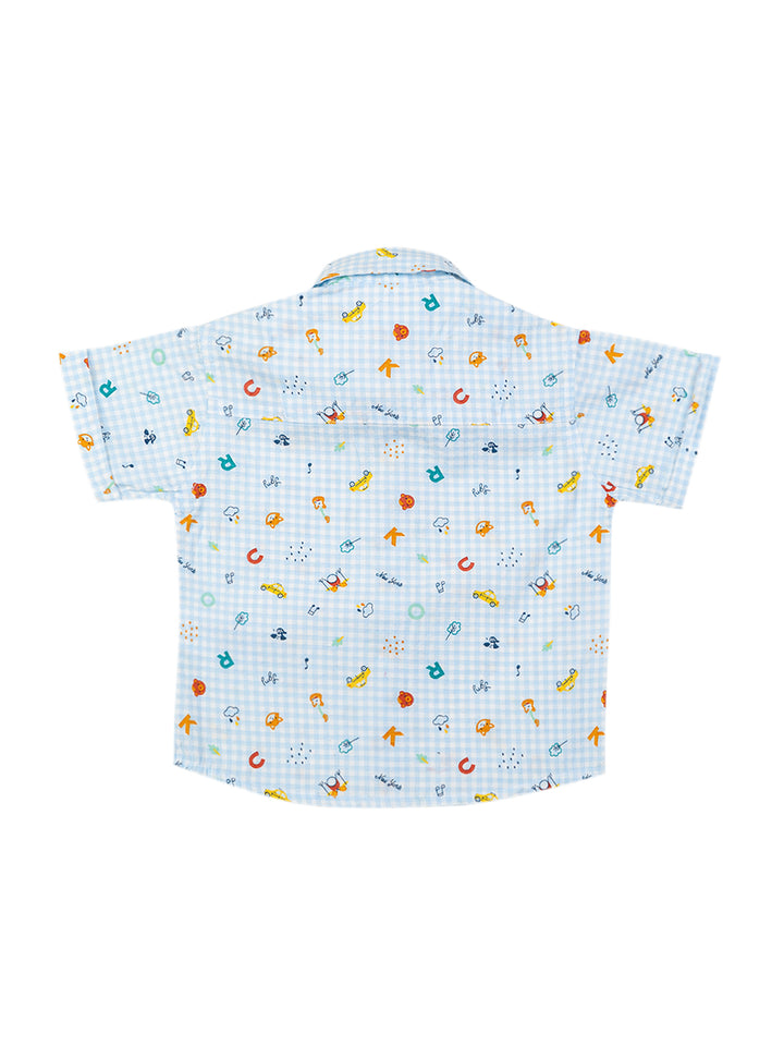 This Mee Mee cotton short set in light blue features a fun printed shirt paired with comfortable denim shorts. The shirt has a lively pattern with various objects and alphabets, making it playful and appealing. The elastic waistband ensures a snug fit, while the breathable cotton fabric keeps your child cool all day. Perfect for casual outings or playtime.