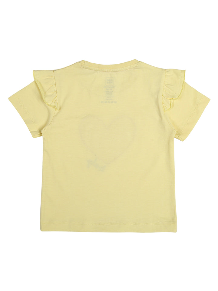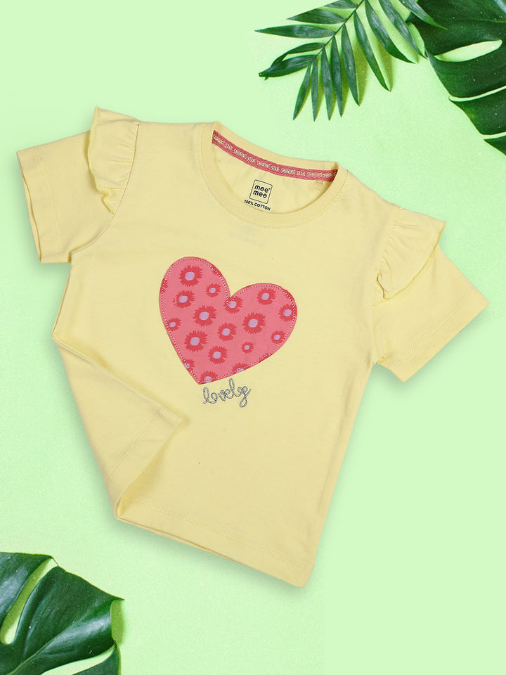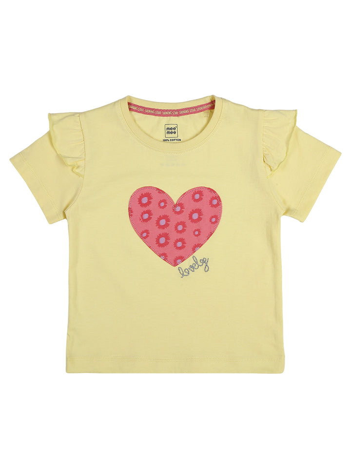 Brighten up your little one's wardrobe with the Mee Mee cotton T-shirt in yellow. Made from soft, breathable cotton, this stylish tee features a cute heart print with delicate ruffle details on the sleeves. Designed for all-day comfort, it offers a relaxed fit and a classic round neckline. Perfect for casual outings or playdates, this charming T-shirt pairs effortlessly with jeans, shorts, or skirts.