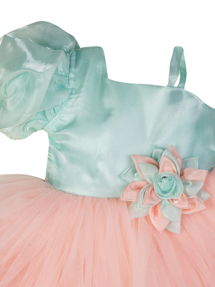 This gorgeous Mee Mee frock features a satin bodice with a stylish shoulder design and a soft, layered net skirt for a dreamy look. The delicate floral applique adds charm, making it perfect for special occasions. Comfortable and lightweight, this frock ensures your little one looks adorable while feeling at ease all day.