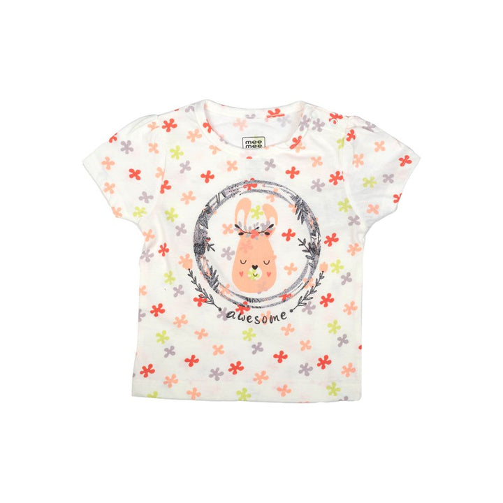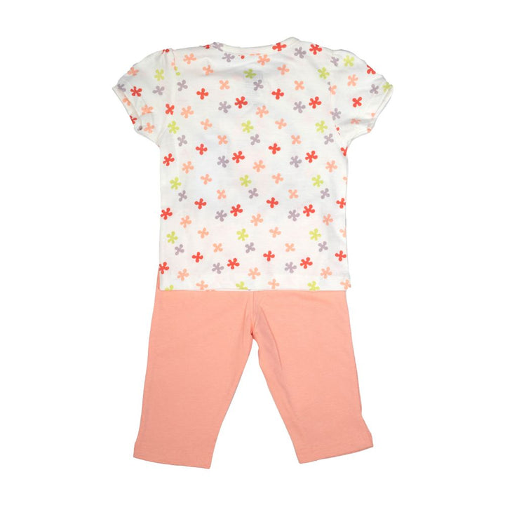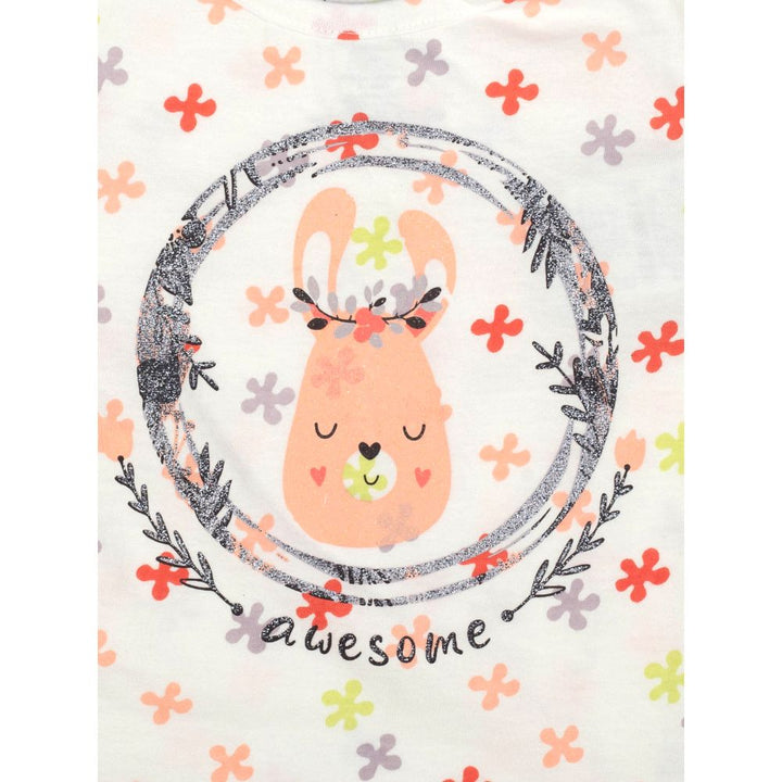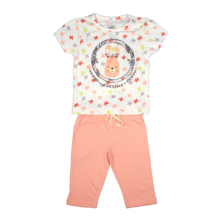 We bring to you this Night Suit with White allover floral print with bunny chest print & solid peach pajama. This is made from soft fabric that will keep your baby girl comfortable. This night suit is easy to wear and features attractive patternYour little one will feel cozy & relaxed in our 100% Cotton made night suit. It is paired with Soft knit for comfort with plenty of stretch for night warmth</p>Key FeaturesTee Sleeves: Half Sleeve Tee Neck: Round Tee closure: Neck open Tee Pattern: PrintedPajama Length: Full Pajama Waist: Elasticated with Tieup Pajama Pattern: Solid Occasion: Night Wear Fit: Comfort Fit<h2>Specification</h2>Quantity: 1 Bottom and 1 Tee<h3>Care Information</h3>Wash Instructions: Soft Wash with warm or cold waterTumble DryDo not BleachIron Instructions:Use warm iron and on Cotton ModeDo not iron directly on printsWash Type: Machine Wash or Hand Wash