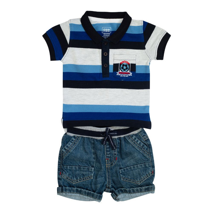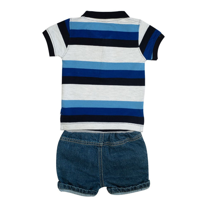 We bring to you this stylish Shorts set with Blue Stripes Tee Denim Shorts that will be a great addition to your baby boy's essentials collection. Crafted from soft fabric, the set has a tee that features collar neck and an elasticated waist shorts for easy dressing. Made from 100% cotton this Shorts set is comfy and perfect for all your baby?s needs.