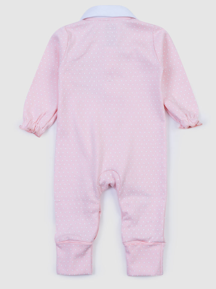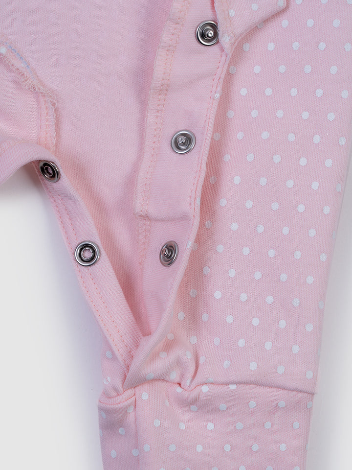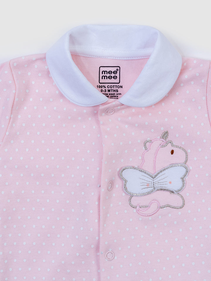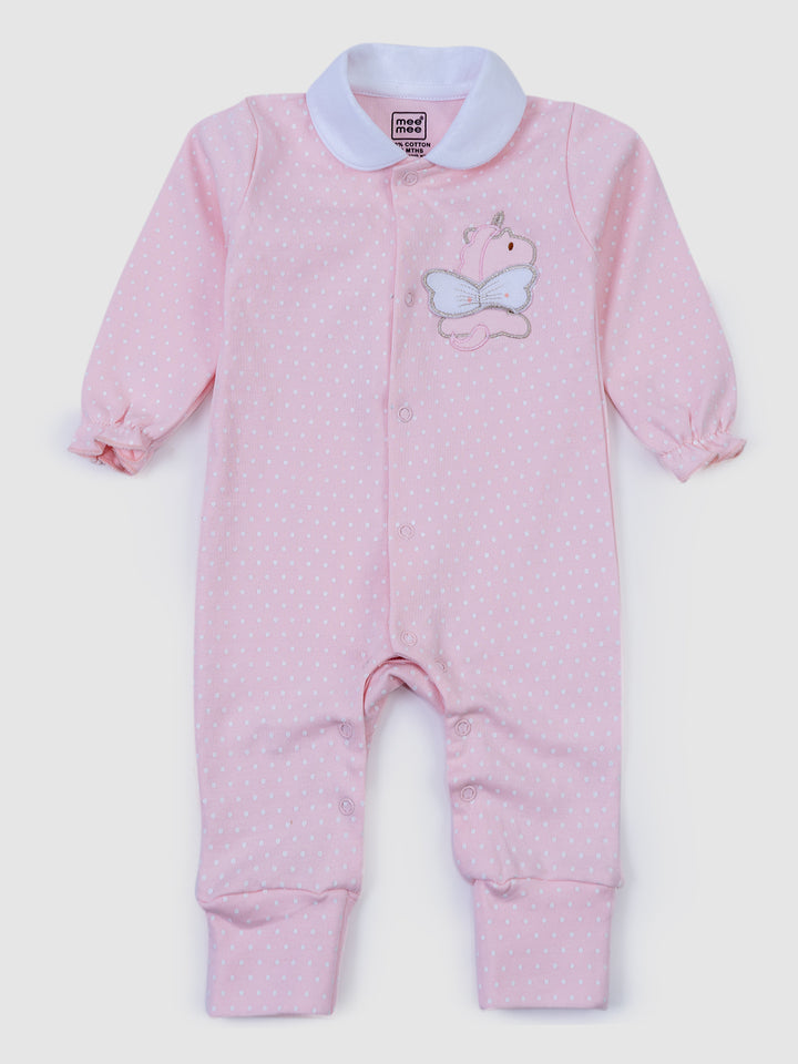 Mee Mee Light Pink Cotton Romper | Full Sleeve Polka Dot Baby Suit with Butterfly Patch