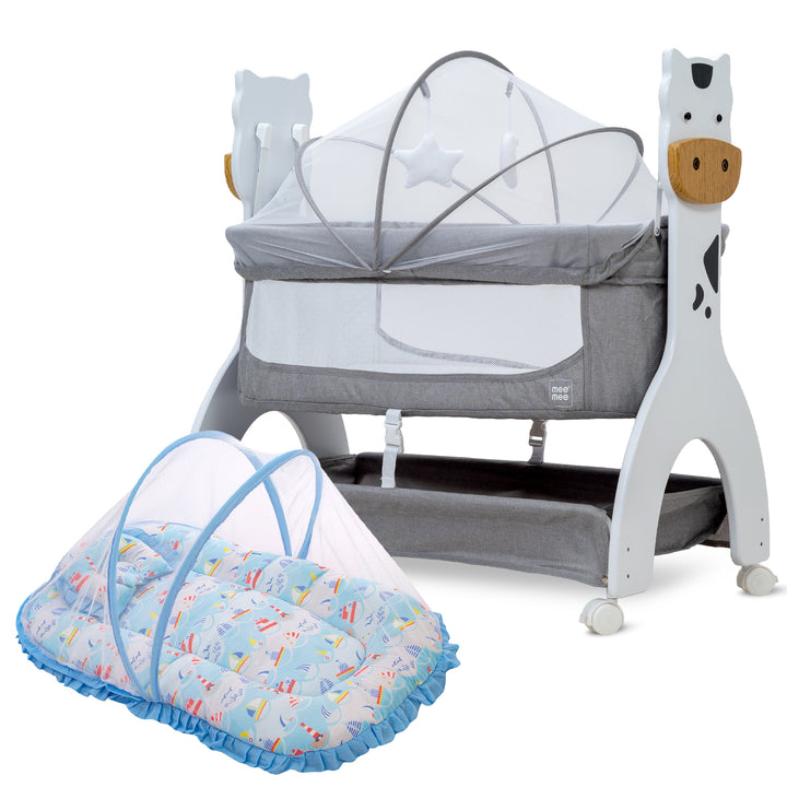 Mee Mee Manual Swing Cradle for Newborn Baby with Mosquito Net & Mattress Pad, Cot Bassinet with Wheel Lock for Kids 0-18 Month Infants| Carries up to 15kgs (Grey) + Mee Mee Cushioned Baby Mattress Set with Mosquito Net and Pillow - Sea