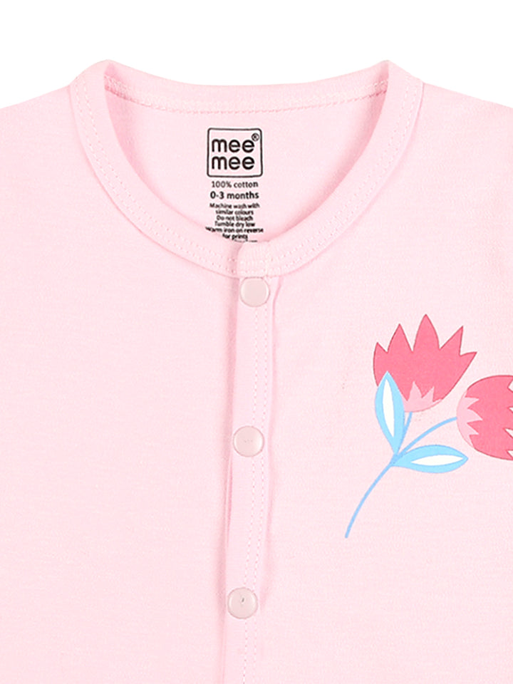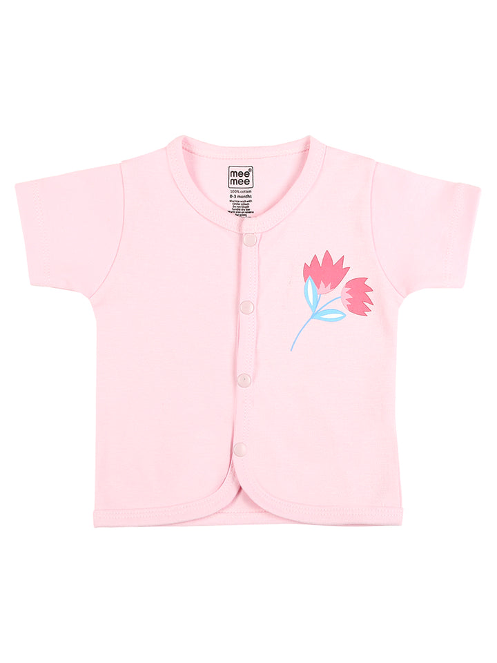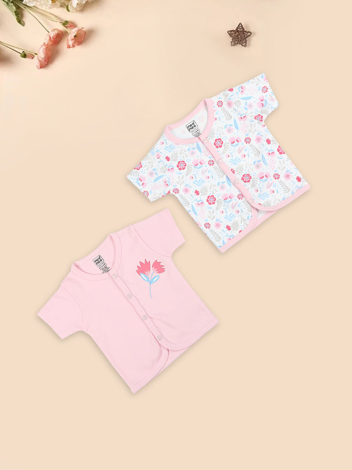 Mee Mee presents a premium Jabala Value Pack, featuring two soft cotton front-open shirts for babies. One solid pink with a delicate floral print and another with an all-over floral pattern, these short-sleeve tops ensure ultimate comfort. Designed for easy dressing with secure snap buttons, they are perfect for everyday wear, keeping your little one cozy and stylish.