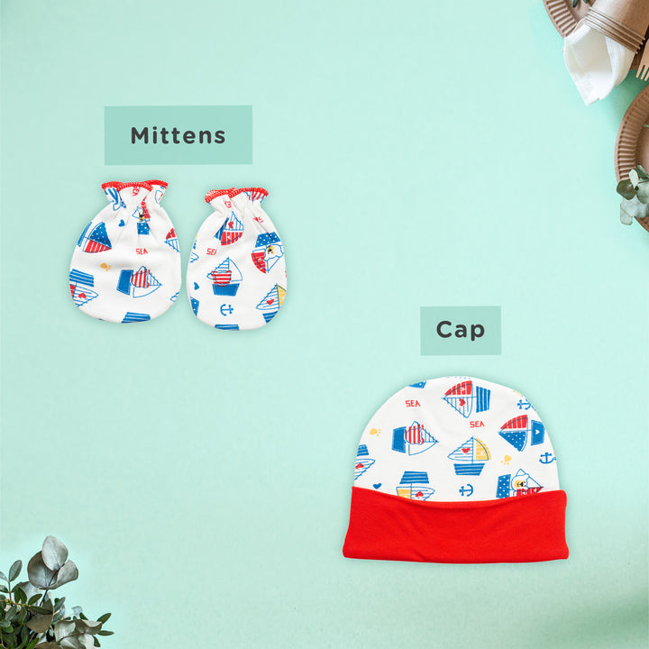 - 1 baby tshirt jabla, 1 baby full pajamas, 1 soft round cap, 1 set of easy-to-wear mittens booties, 2 soft baby napkins