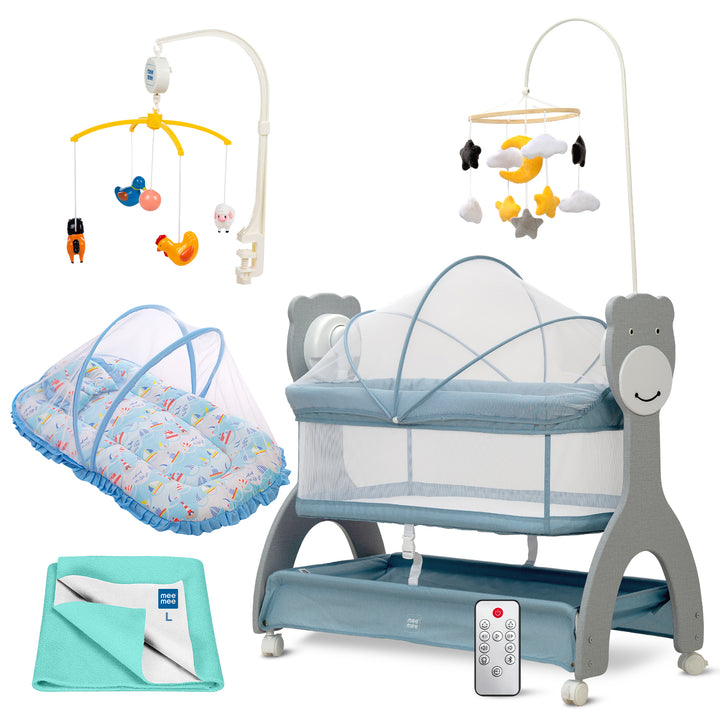 Mee Mee Combo : Automatic Electric Cradle for Baby + Musical Animal Cot Mobile (4-Toy Safari Theme)