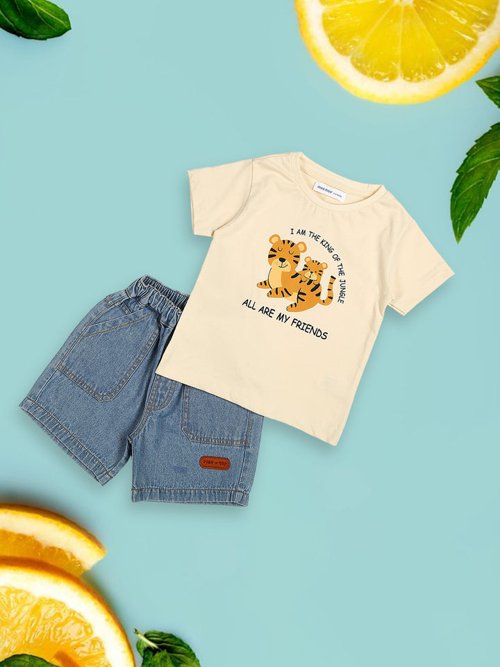 Let your little one play in comfort and style with the Mee Mee Yellow Tiger Print Single Jersey Short Set. Made from soft and breathable single jersey fabric, this adorable set includes a printed yellow T-shirt featuring a playful tiger design and a pair of comfy denim-style shorts. Perfect for everyday wear, outings, or playtime, this lightweight and durable set keeps your child looking stylish while staying at ease.
