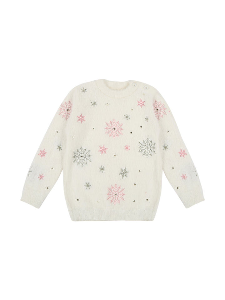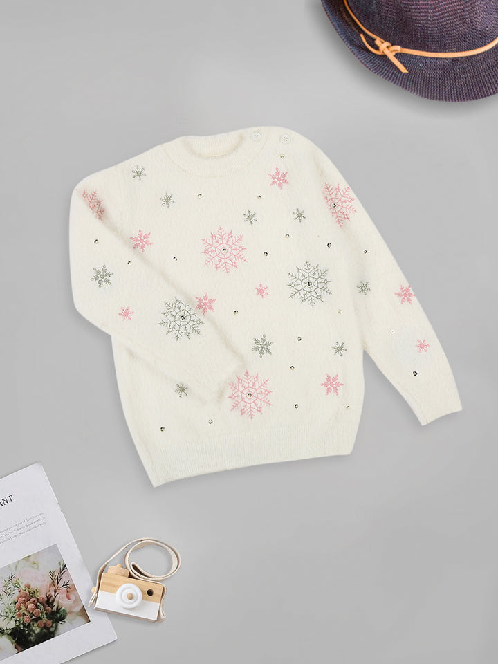 MEEMEE Floral Elegance: White Acrylic Sweater with Pink and White Flowers