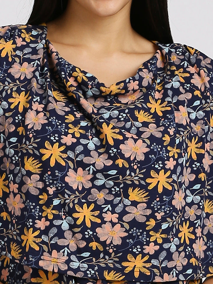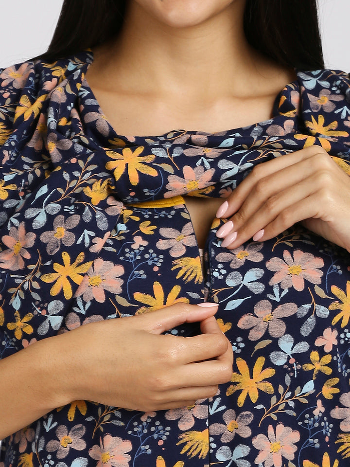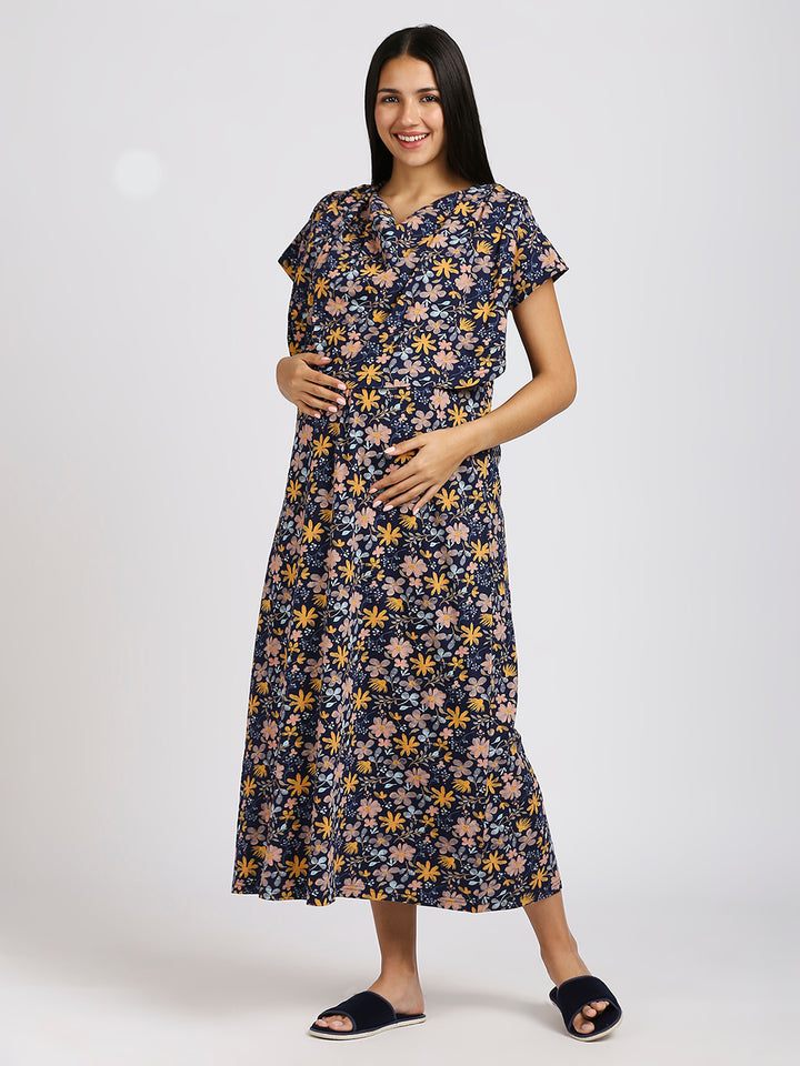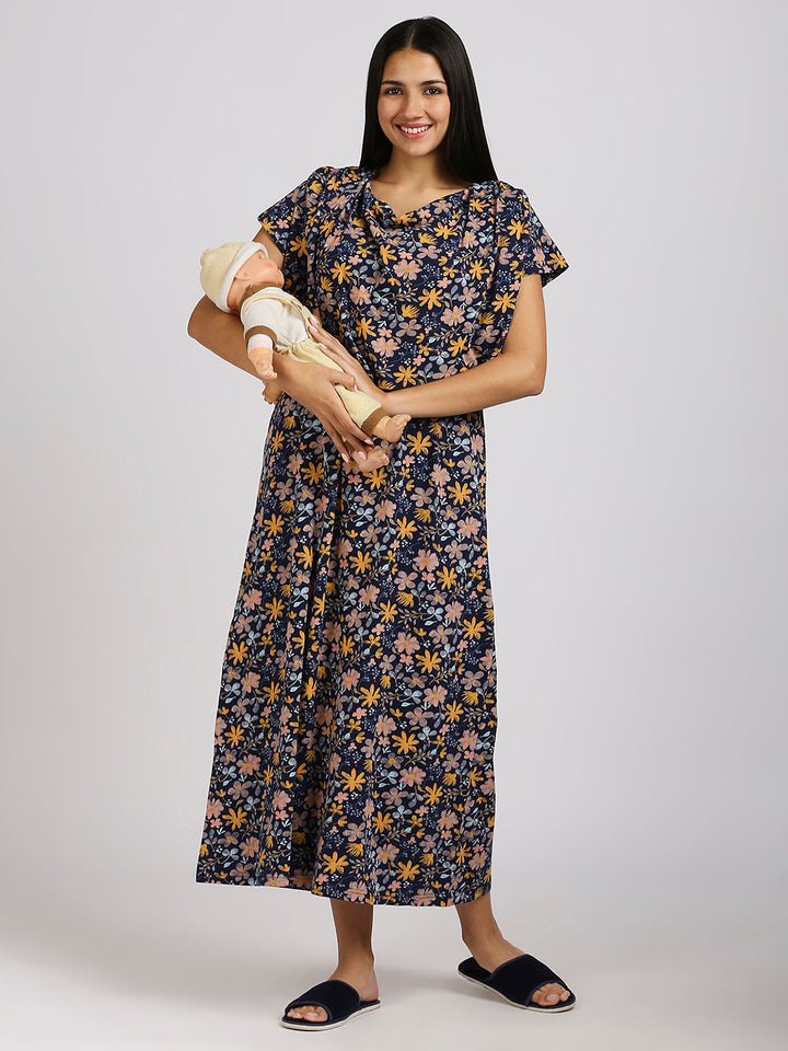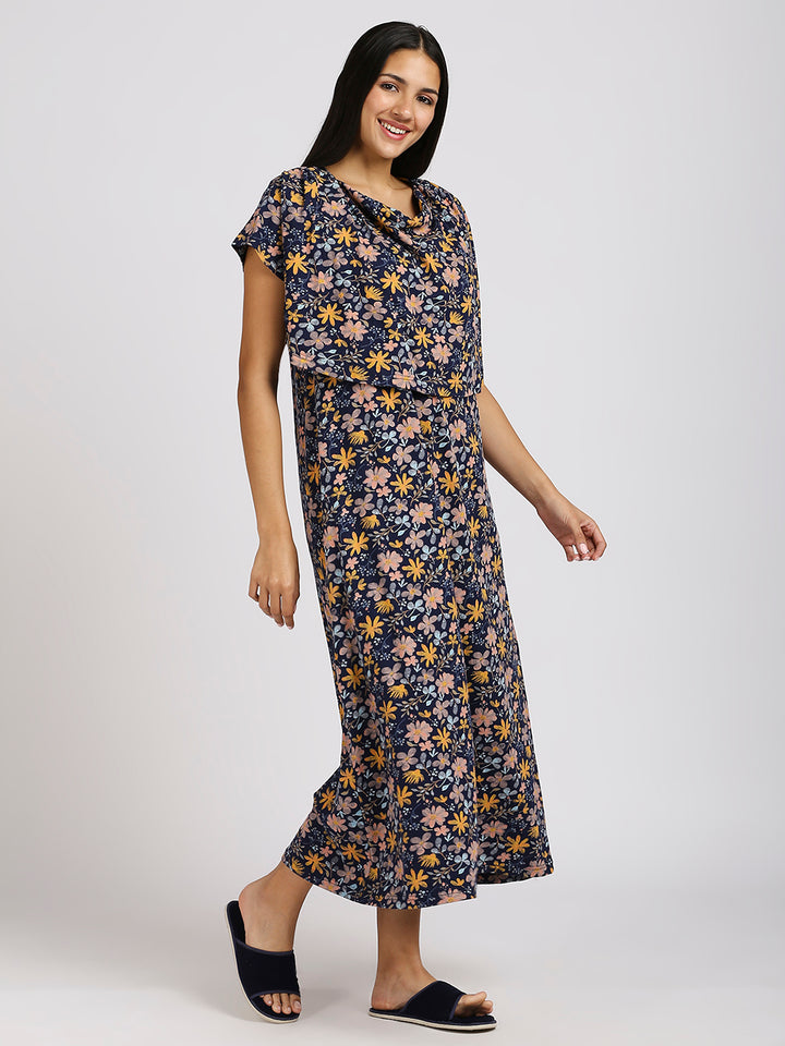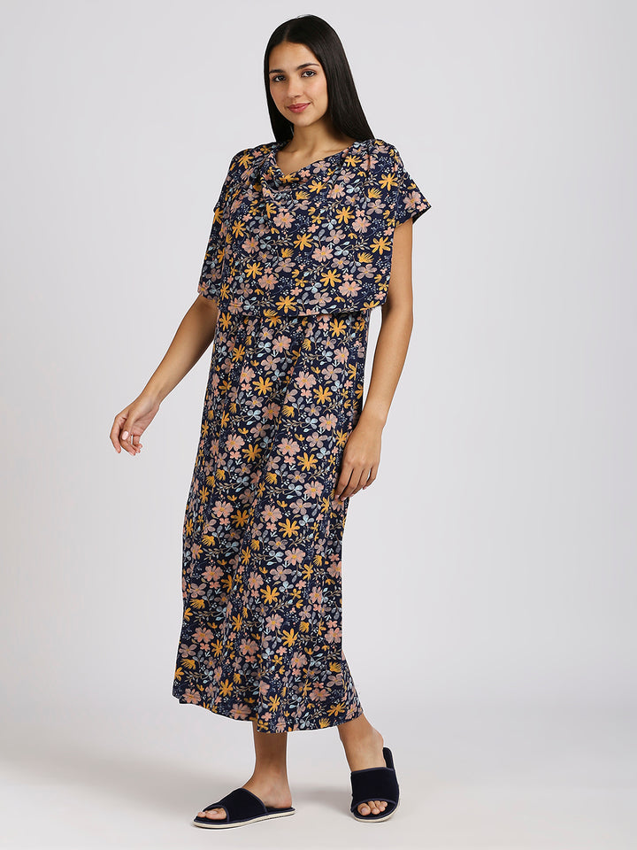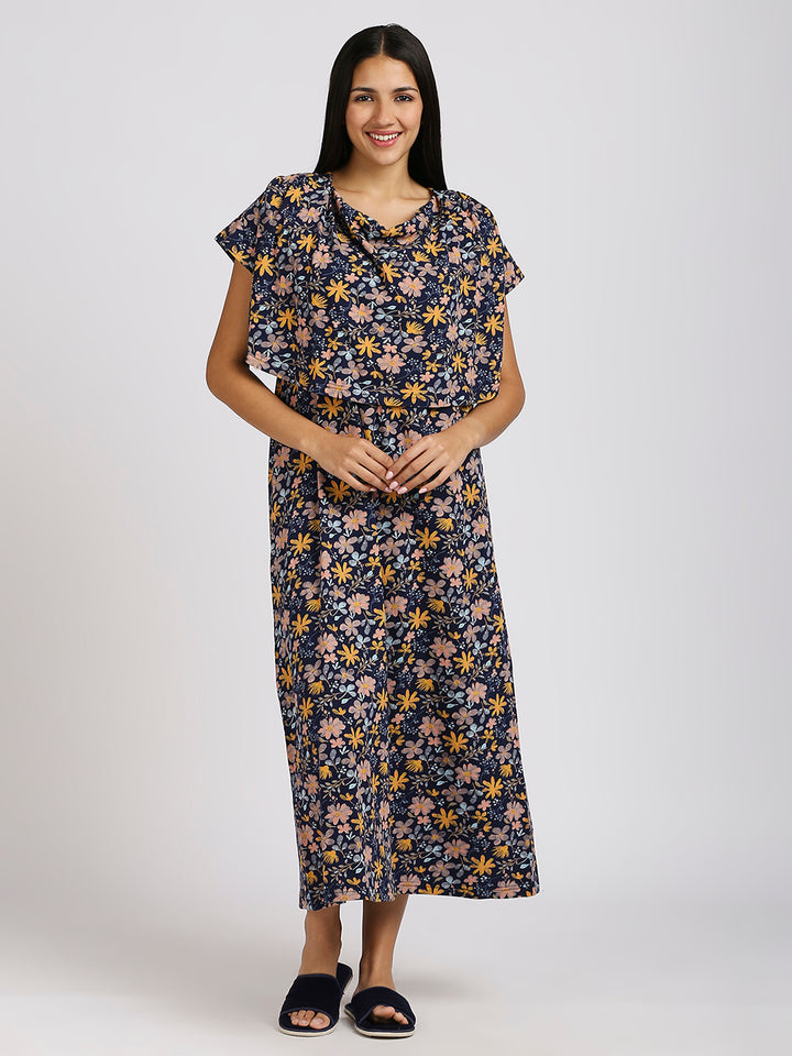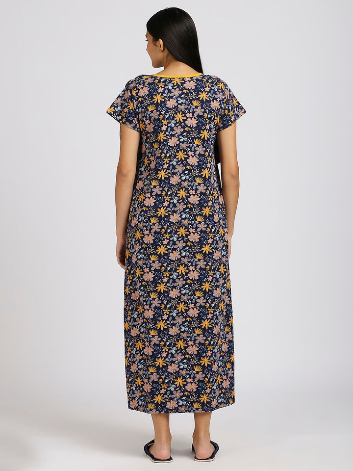 MEEMEE Navy Floral Print Nightgown in Cotton Blend - Elegant Comfort