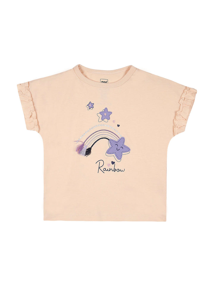 Brighten up your little one's wardrobe with the adorable MEEMEE baby t-shirt! Crafted from soft single jersey fabric, this peach-colored tee features a delightful rainbow and twinkling stars, perfect for sparking joy and imagination.