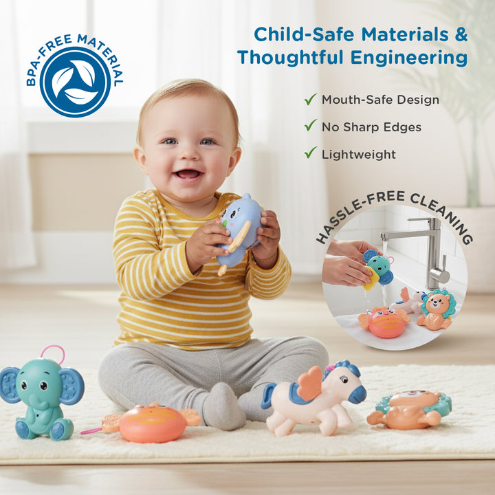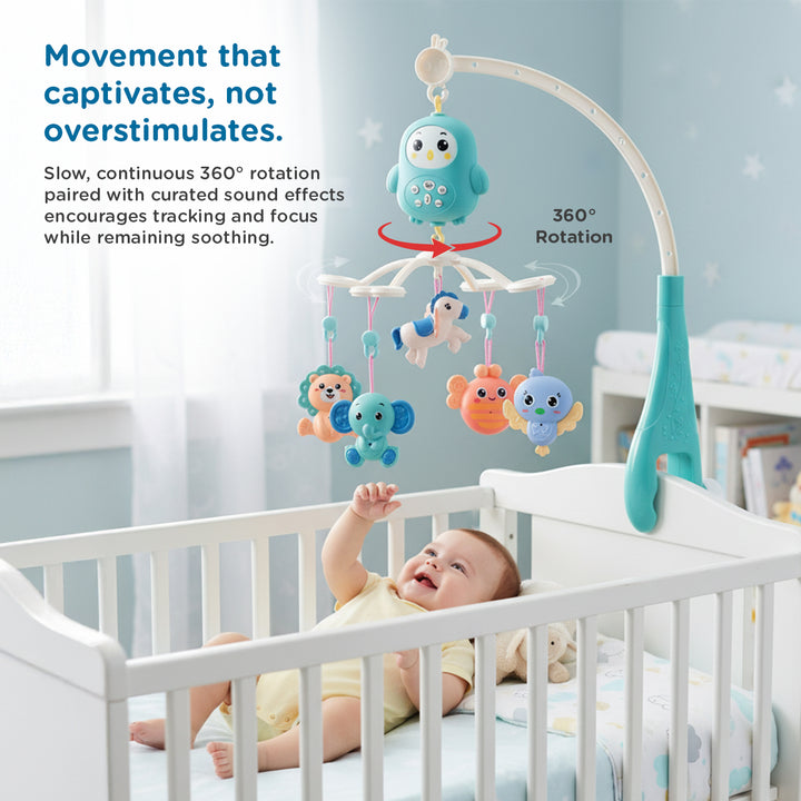 This multifunctional baby crib mobile is designed to provide soothing comfort, visual stimulation, and auditory engagement for newborns and infants up to approximately 12 months. It features 360° rotation, a music box with multiple melodies, a starlight projection function, and a convenient remote control for easy operation without disturbing a sleeping baby. The mobile includes several adorable, colorful, and detachable hanging rattle toys designed to capture your baby's attention.