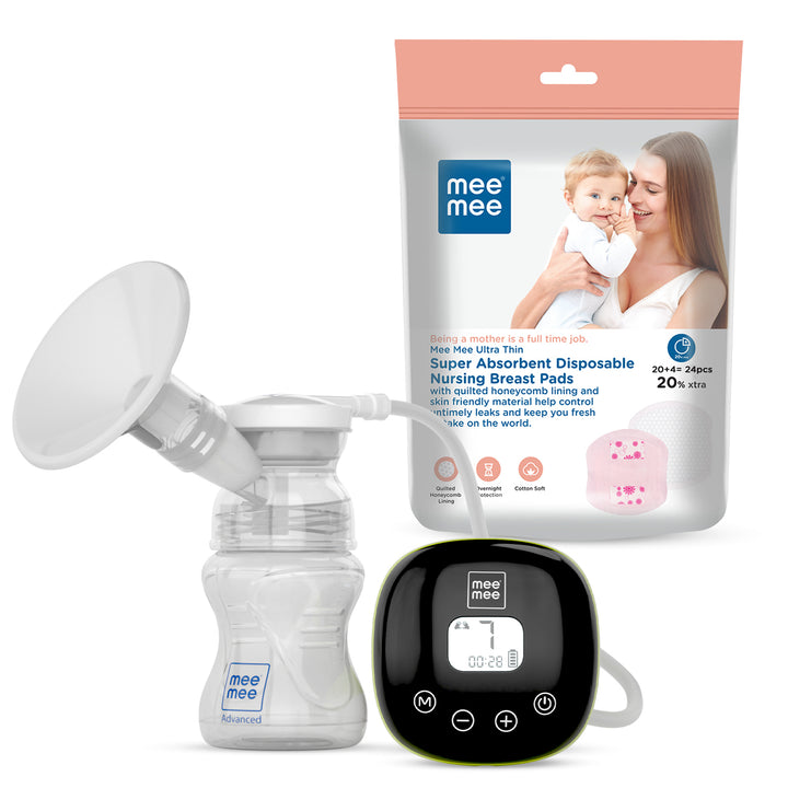 Engineered for hygiene and convenience, this BPA free electric breast pump features a closed anti-backflow system that prevents milk contamination and ensures easy cleaning. With multiple control indicators, including suction timer, battery display, and adjustable suction levels, you can customize every session according to your comfort. The mee mee advanced digital electric breast pump offers massage and suction modes with up to 9 intensity levels for smooth, efficient milk flow and relief from engorgement. Compact, lightweight, and portable, it comes with two complimentary breast pump pads and a one-year warranty. Thoughtfully designed for comfort, efficiency, and safety, the Mee Mee Adore Electric Breast Pump is a trusted companion for every breastfeeding mother.